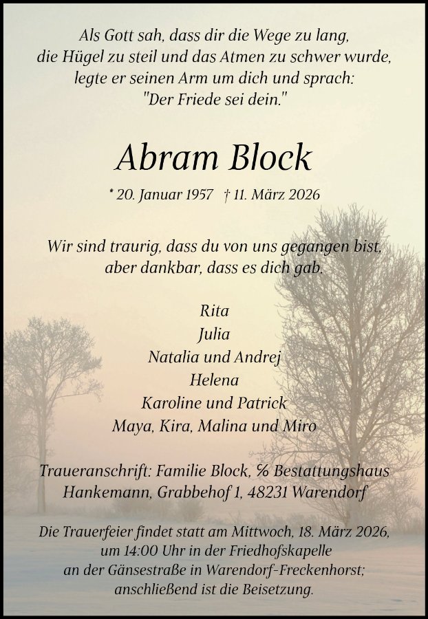 in diesen Tagen fühlen wir mit Ihnen und wünschen Ihnen von Herzen, dass Sie aus den glücklichen Erinnerungen Kraft schöpfen, um positiv in die Zukunft zu gehen. Diese Gedenkseite möge Ihnen dabei helfen, Ihre Trauer zu teilen und das Andenken gemeinsam wachzuhalten.