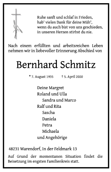 Auf Grund der aktuellen Situation hat die Beerdigung im engsten Familienkreis stattgefunden.