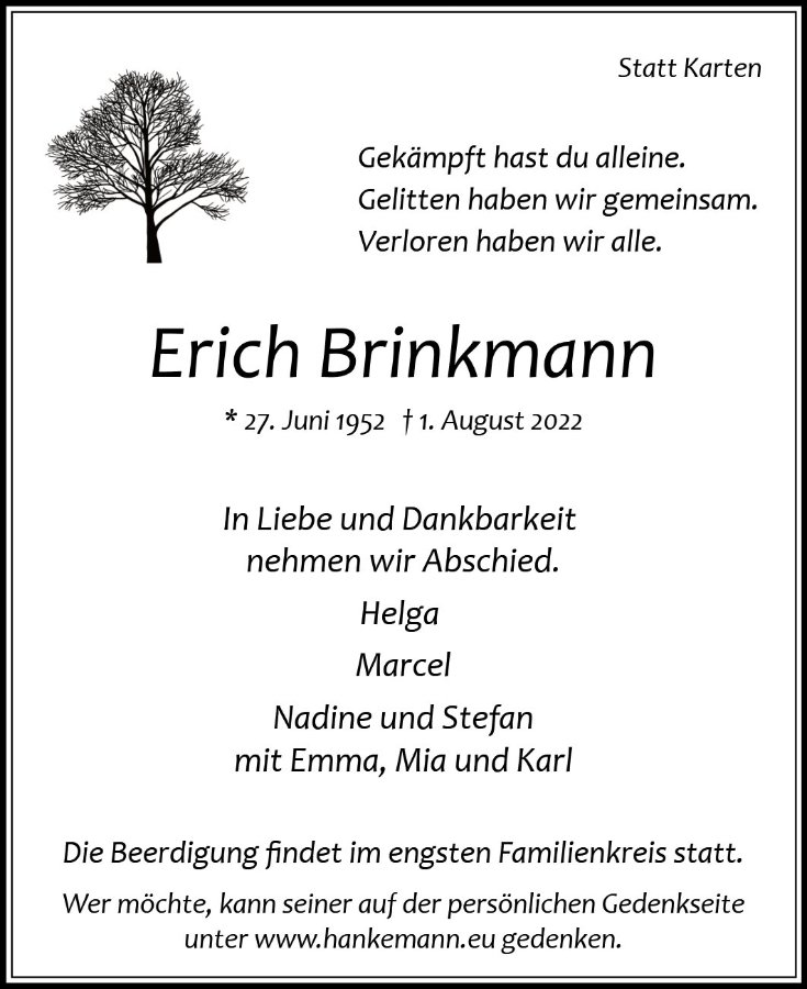 Liebe Helga und Familien, heute, am Tage der Rückkehr aus einem Urlaub, haben wir mit Bestürzung die Nachricht erhalten, dass der Liebe Erich nun seinen irdenen Lebensweg beendet hat.