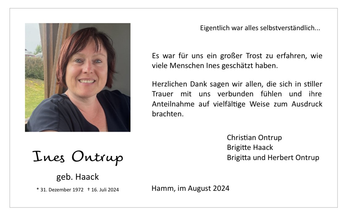 Tief erschüttert und betroffen waren wir von der traurigen Nachricht, dass Frau Ines Ontrup so früh und für die meisten von uns unerwartet verstorben ist.