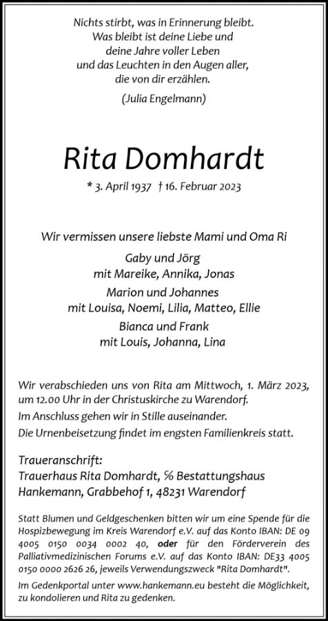 Ich wünsche euch allen ganz viel Kraft beim Heimgang eurer lieben Mutter Rita und Oma Ri.
