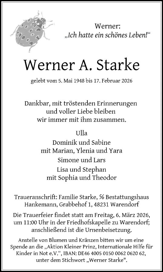 wir wünschen Ihnen von Herzen viel Kraft, dass Sie Menschen um sich haben, die Ihnen in dieser schweren Zeit beistehen und Halt geben. Zusätzlich können Sie auf dieser Gedenkseite Erinnerungen teilen und so das Andenken gemeinsam wachhalten.