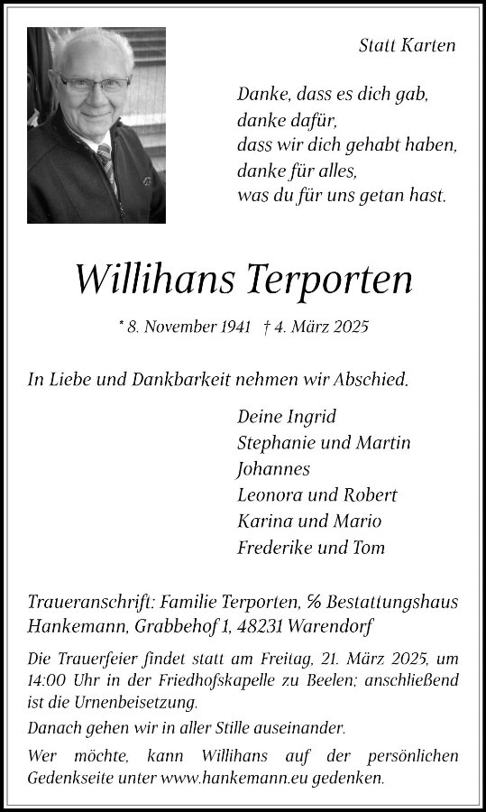 Nun hat Willihans seine letzte große Reise angetreten. Wir erinnern uns gerne an einen Busfahrer, der kompetent und immer gut gelaunt auf den Reisen unterwegs war. Ob jung oder alt, für jeden hatte er ein freundliches Wort, sei es in hochdeutsch oder in plattdeutsch.